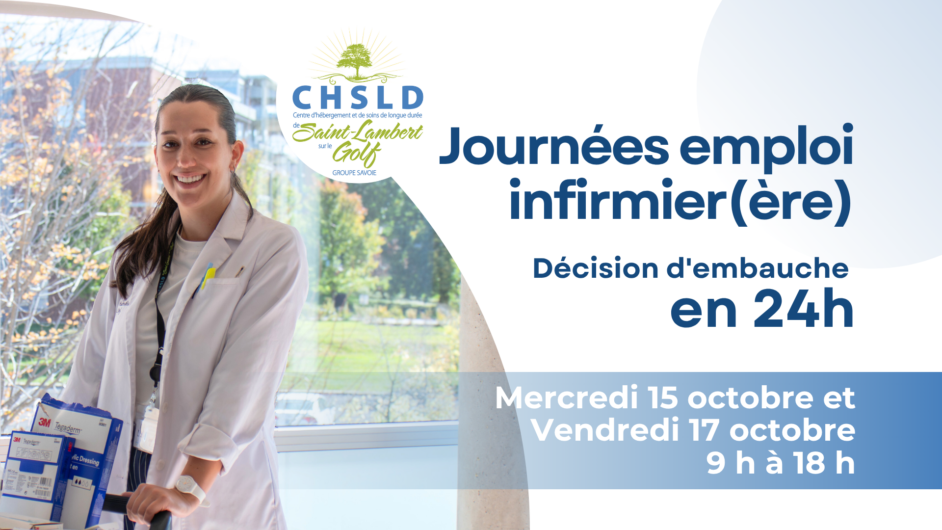 Ne manquez pas les Journées de l’emploi Infirmier(ère) au CHSLD Saint-Lambert sur-le-Golf, le mercredi 15 et le vendredi 17 octobre de 9 h à 18 h (avec ou sans rendez-vous).